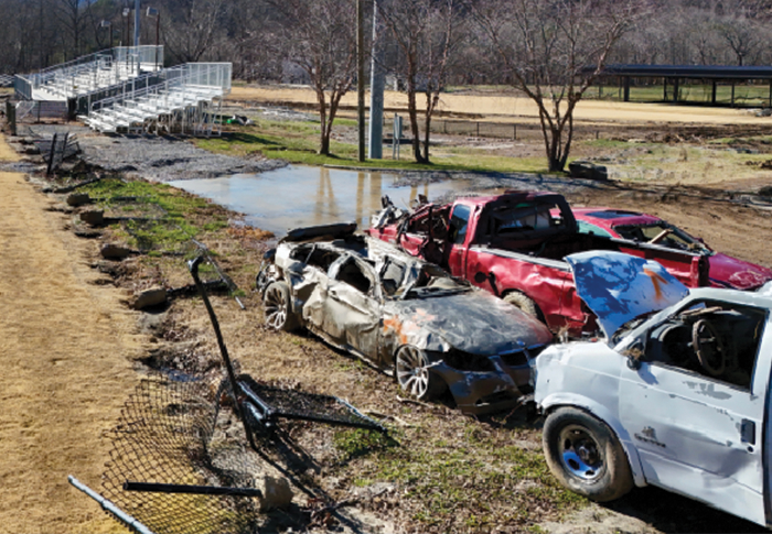 Floodwaters reached the first floor of every campus building, leaving behind debris, mud, and silt. Proper disposal of vehicles was critical to mitigate environmental risks from fuel, oil, and chemicals. Cadaver dogs were deployed to search for remains.
